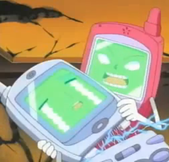 (グリ) and (グラ), also known as Grin and Bareit in the English dub: Two sentient cell phones who serve as Tsuru Tsurulina IV's strongest assassins, sent to pursue the rebels to the Evil Blood Mansion. However, the impact from their crash-landing damages Gura, while Guri explodes while trying to repair him.