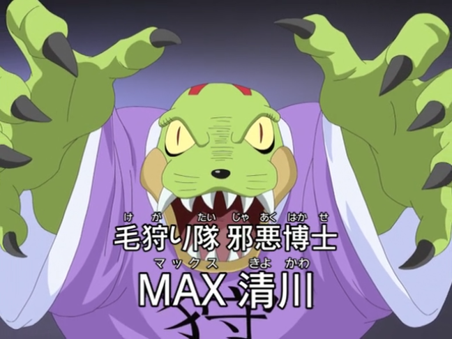 (MAX 清川, MAX Kyokawa): The "evil doctor" of the Hair Hunters, this lizard man captures Bo-bobo within a strange bio-liquid (which Don Patch and Kappa make into soup) and brainwashes him into fight against his friends. It seems to be a success, as Bo-bobo goes as far as to attack Beauty, and Don Patch is forced to fight against him. However, at one point, Bo-bobo reveals that he was just kidding, as according to Heppokomaru, it is impossible to control Bo-bobo, and Kyokawa is put on trial for the deaths of Guri and Gura.