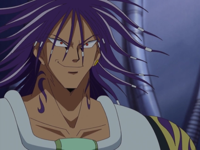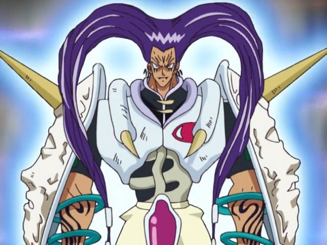 Giga is the leader of the most powerful district of the Maruhage Empire: Cyber City, and is allegedly Tsuru Tsurulina IV's equal. In appearance, Giga is a large muscular man with spiked purple hair. His armor is very abstract, with strange patterns on some parts, and green rings hanging around his arms. Giga's personality is not a pleasant one. He is extremely cruel to the inhabitants of Cyber City, he disturbingly enjoys toying with his opponents, and the only thing he seems to care about is his ever-growing art collection, which consists of the fist masters that he turned into abstract sculptures.