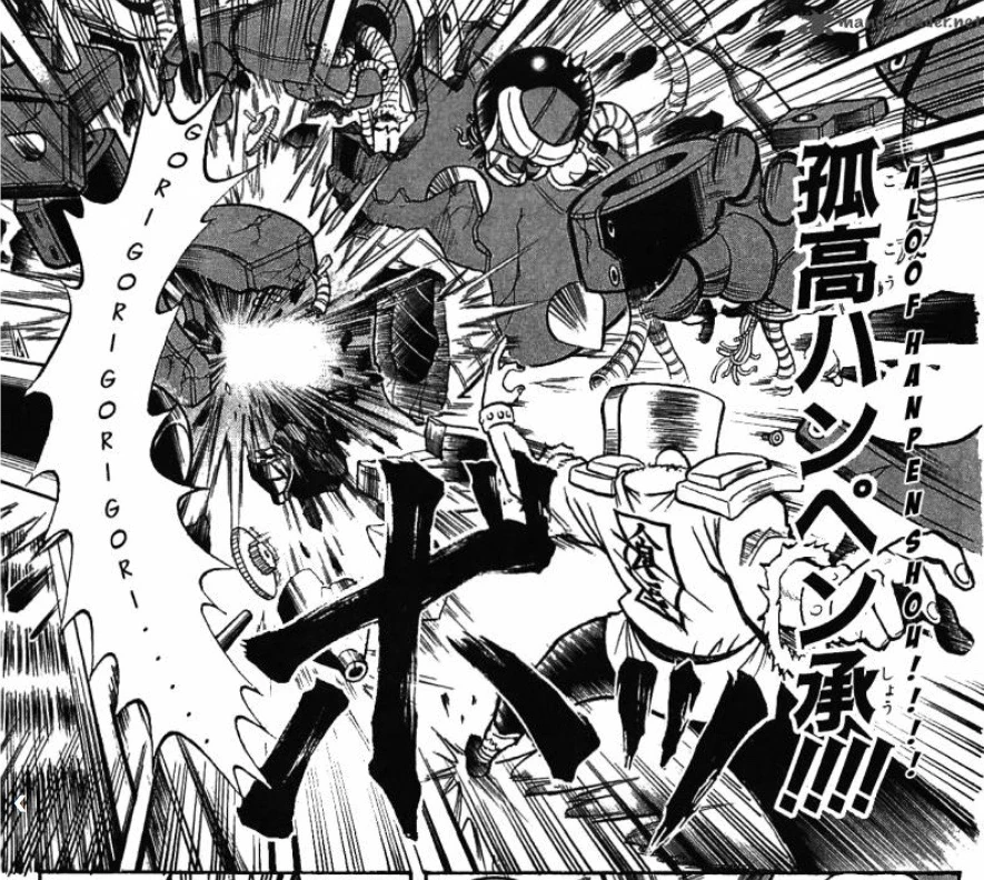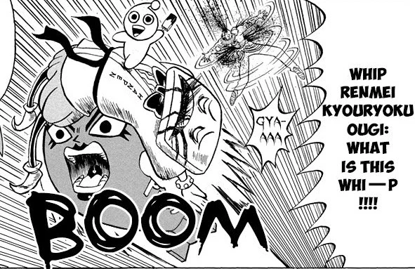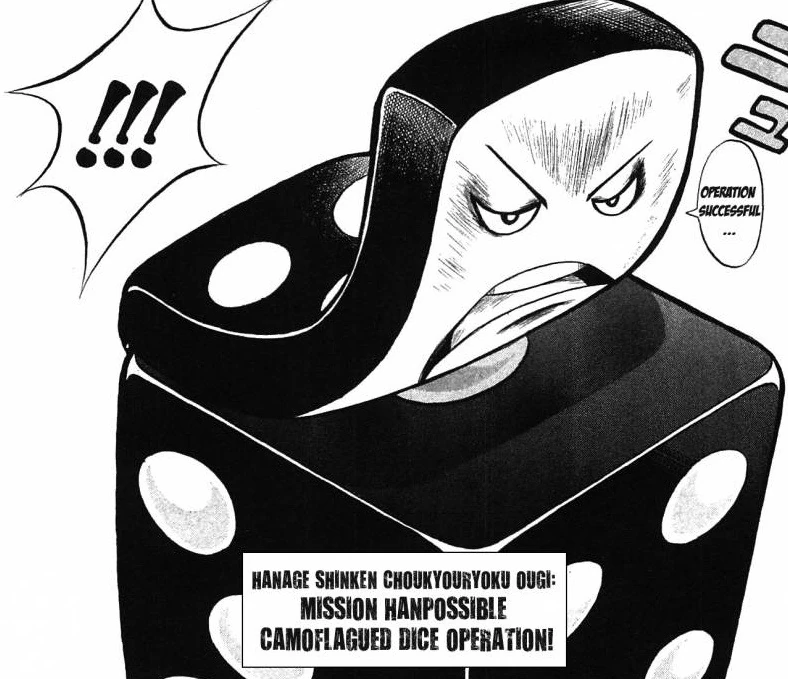 On a lesser note, Hanpen can also tear off or reattach pieces of his head, or he can take it off entirely. This ability is shared by Tokoro Tennosuke and most other food-based beings of the series.