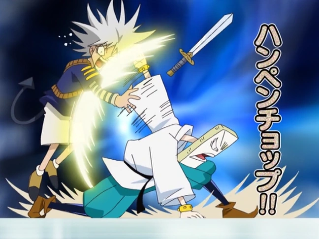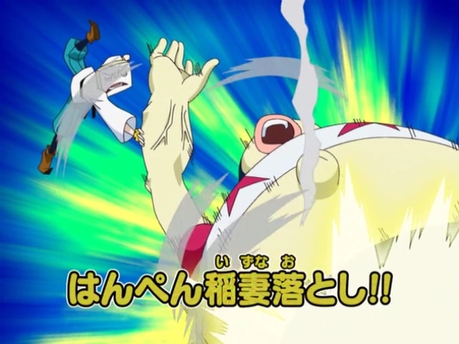 When first introduced, Hanpen is being awakened by the current era, due to the Bo-bobo threat. He and the other Block leaders are assigned to Neo Hair-Hunt Land MAX, in order to ambush Bo-bobo and the other rebels. Hanpen watches his foe from a distance, while the rebels defeat all of the other block leaders. By the time Bo-bobo has finished with the other Block leaders, Hanpen makes an intimidating entrance. Upon doing so, he challenges Bo-bobo and the others to a fight, and instantly creates an arena made of giant fishcake and oden soup.
