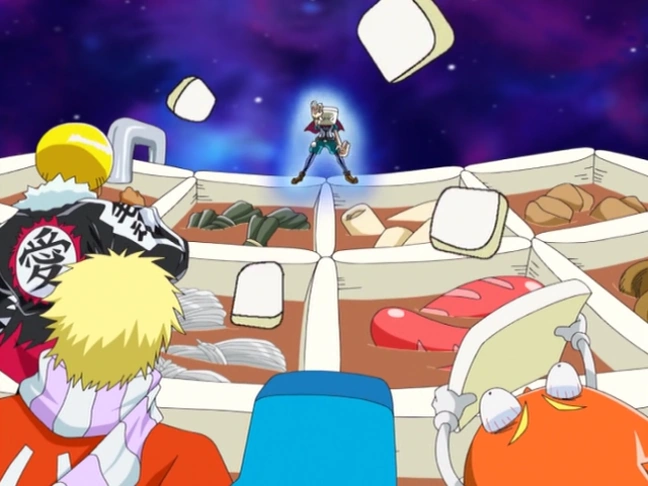 - 好き嫌いは・・・なくそう・・・ねー!: Hanpen, Ujikin TOKIO, and Ochazuke Alien summon a giant bowl of rice soup, followed by a giant fishcake and shaved ice to fall on the opponent.
