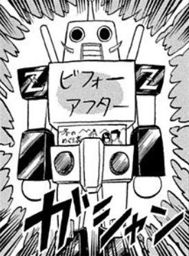 (シュバルツ・ベッケンバウアー, Shubarutsu・Bekkenbauā): A robot who tries to make friends by showing off his complete DVD collection of the drama Winter Chance-Meeting. But when Bo-bobo and Don Patch discover that the drama is about nuts and bolts, they destroy the DVDs and smash the robot with ramen. "ビフォーアフター" is written on his chest.