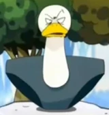 (タカシ)/Lucky: A pair of underwear with the head of a duck who Kilalino wears like a regular pair of underwear. While believing that he is a normal duck, he eventually learns that is a bad joke material. In the anime, he is worn on top of Kilalino's head, and learns that he's actually a swan ("dundie" in the English dub). He is 26 years old.