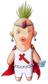 L is a small man with a tuft of green hair, wearing a red cape, and a shirt with a red cross on it. Though he serves as the final boss, he isn't very intimidating, until he fuses with J.