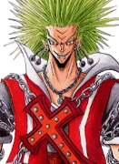 Jail has green spiky hair spread all over his head, the cross on L's shirt is now a massive necklace, and L's cape has become a red vest. Jail also wears a grey shirt, with grey jeans (the jeans have cages built into his right leg. Jail also has chains strapped his body, even his earrings are small chains with large iron balls on the ends of them.