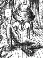 (ウンコ, Unko): A humanoid-being with a head of poop, similar to another character. While sitting by a tree, Poop is first encountered by Chinnen, who is shocked by his appearance and identifies him as the monster that has been eating people. Before Chinnen can kill him, Unko asks to let him tell his story. Three days prior, he had heard a woman scream in the mountain, only to find her being abducted by alien. After Chinnen hears a loud noise, Poop casual tells him that it came from Man-Eater Pukkatsu. After Poop introducing himself, Chinnen rushes to the cave to find Pukkatsu, while Poop follows him.