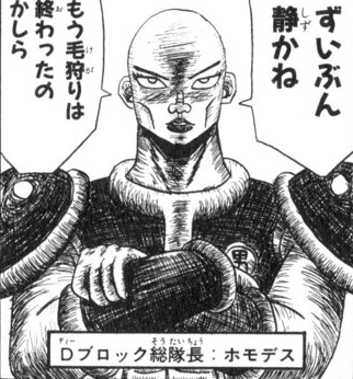 (ホモデス): The leader of D-Block. In the main series, his role is replaced by Hagen, while his title is given to Kitemasu.