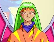 A green haired youth, with orange clothing, four forked tails, and devilish looking wings on his back. Nice Guy is one of the Four Heavenly Kings of the Flower Demon King. While not his real name, he prefers to call himself "Super Lady Killer" (超色男, Chō Iro Otoko). He also has habit of calling everyone he meets "Tanaka" because he can't remember names well. Nice Guy also has a love for dogs.
