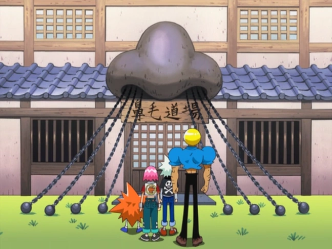 In order to properly train Heppokomaru, Bo-bobo decides to bring him to the Nosehair Dojo, which is an odd training facility, with a giant nose stationed above the door, and multiple ball-and-chan nosehairs coming out of it's nostrils.