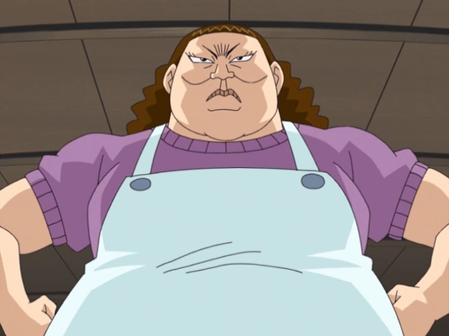(オバサン, Obasan): A middle aged woman who is the master of the dojo. She is the second challenge of the dojo, with the power to create five shadow clones of herself (and one old man), but in the end, she and the clones wound up turning into sake bottles. Like Bo-bobo, she too uses Hanage Shinken.