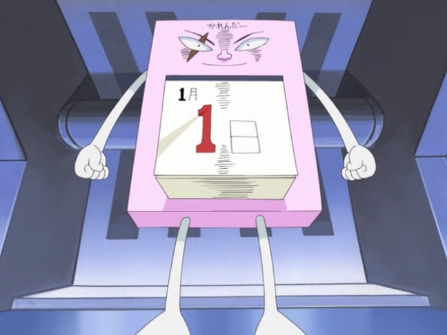 (カレンダー, Karendā): Calendar is just that; a living calendar, with a scar on his right eye. Appearing to be the second of Gunkan's Five Great Warriors, Bo-bobo easily takes him apart by ripping off his pages sequentially, with every one of his pages revealing a new weird holiday.