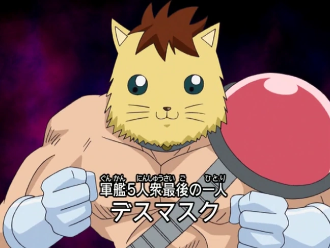 (デスマスク, Desumasuku): The last of Gunkan's Five Great Warriors. Much like June 7th, he is also able to dodge Bo-bobo's Hanage Shinken. He follows Bo-bobo into the land of Babylon (on orders of Gunkan though claims he needed to go to the bathroom.) He reveals himself to be a well muscled man, with the head of a kitten. After Bo-bobo figures out his own weakness, he defeats Death Mask with a seemingly weak arm chop.