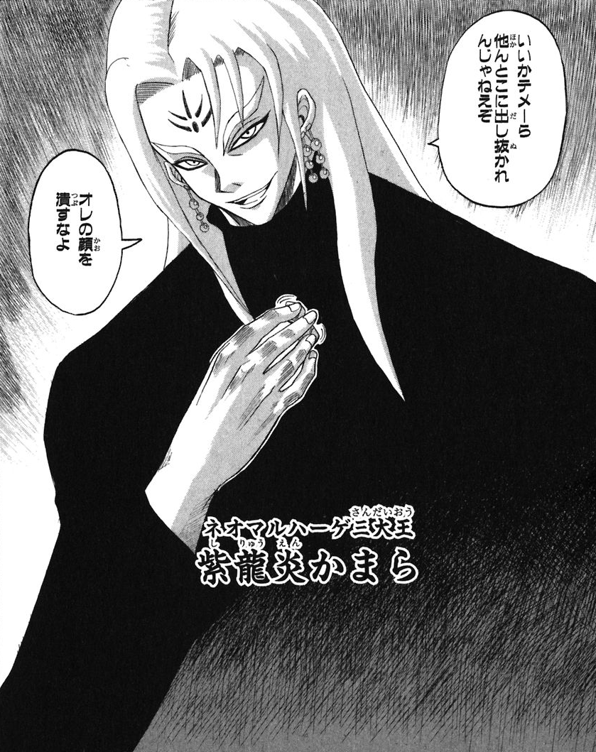 Shiryuen Kamara (紫龍炎かまら) is a character from Shinsetsu Bobobo-bo Bo-bobo. He is one of the Three Great Kings of the Neo Maruhage Empire.