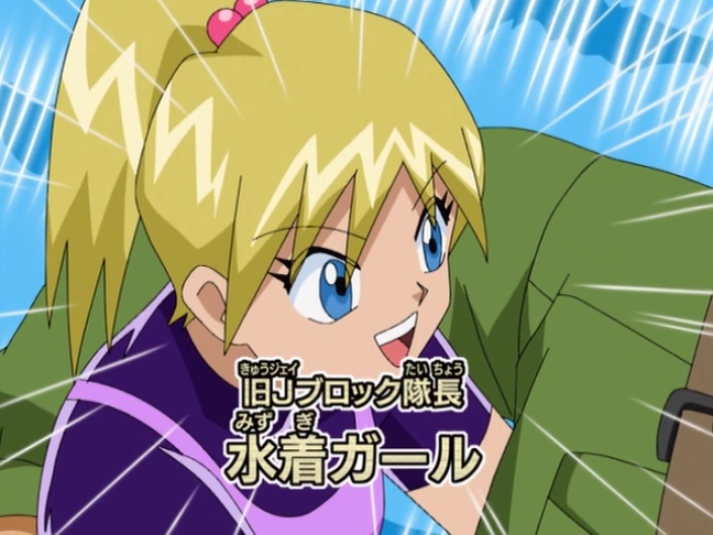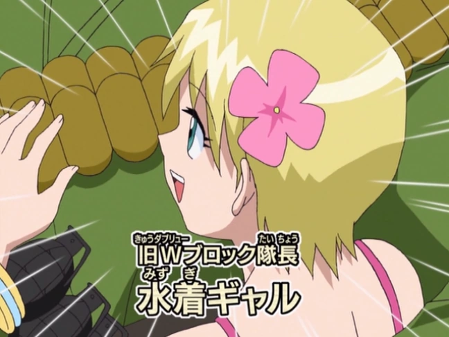 (水着ギャル, Mizugi Gyaru) and (水着ガール, Mizugi Gāru)/Bathing Suit Girl and Bikini Girl (English manga): Two teenage girls in swimsuits who are respectively the former leaders of J-Block and W-Block and working alongside Combat Blues at the water slide battlefield. The two of them comfort their boss every time he's knocked out, instantly reviving him back into action (and leading to accusations of him being a pervert). However, near the episode's end, Bo-bobo turned them to good just before Combat Blues is defeated.