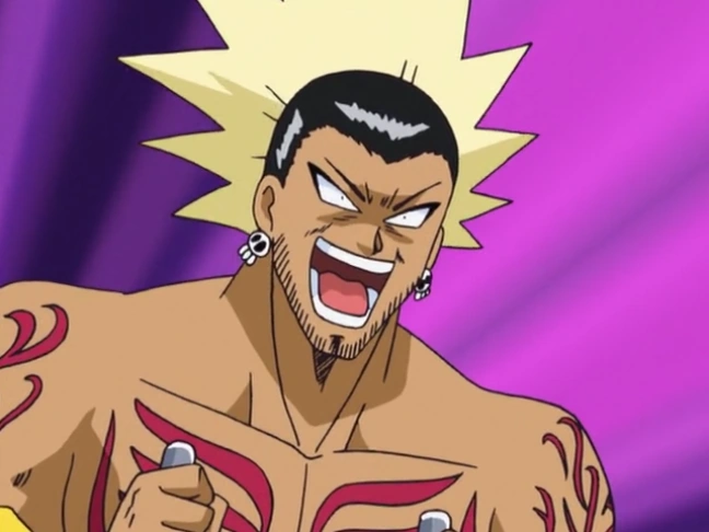 (ラパラパ)/Lapalapa: The Former N-Block Leader, Raparapa is a man with black hair, but has a yellow spiked up ponytail. He wears no shirt, making the many tatoos on his body visible. He was first seen working with Jeda the Wind God and Hagaiou in the ice-skating attraction, "Ice Mecha Ring". He was the one explaining the rules for the match, but despite his knowlege of the area and his superior mech, both he and Hagaiou proved no match for the rebels, though their boss Jeda was shown to be much more capable. But after Bo-bobo and Don Patch fused into PatchBobo, they easily dominated the fight, and made short, humorous work out of the former Maruhage agents.