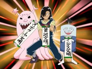 (黄河文明, Kōga Bunmei), also known as Yellow River Civilization in the English dub: The human leader of the trio. This one fights with a sword as well, but has various ninjitsu abilities such as a freezing sweat technique and curling.