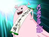 (メソポタミア文明, Mesopotamia Bunmei): A tentacled-horned nose creature, is the trap-master of the castle, controlling an entire room of nearly inescapable traps as well as consistently trying (and failing) to set them off during the battle with Bo-bobo's team. He also appears to try and use a "cloning jutsu". that is sort of obvious to its opponents (since the "clones" are just hot dogs cut into the shape of octopi).